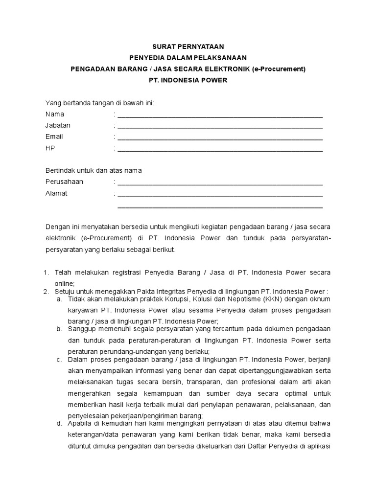 Surat pernyataan kesanggupan penyedia barangjasa. Admin blog Contoh Seputar Surat 2019 juga mengumpulkan gambar-gambar lainnya terkait contoh surat pernyataan penyedia barang dan jasa dibawah ini. Surat Pernyataan Keanggotaan PERTAMINA e-Procurement Asli di Tandatangani Surat Pernyataan di download melalui aplikasi PERTAMINA e -Procurement ditandatangani e Procurement ditandatangani pimpinan perusahaan diatas meterai. 11 Contoh Surat Penawaran Barang Jasa Kerjasama Pesanan.