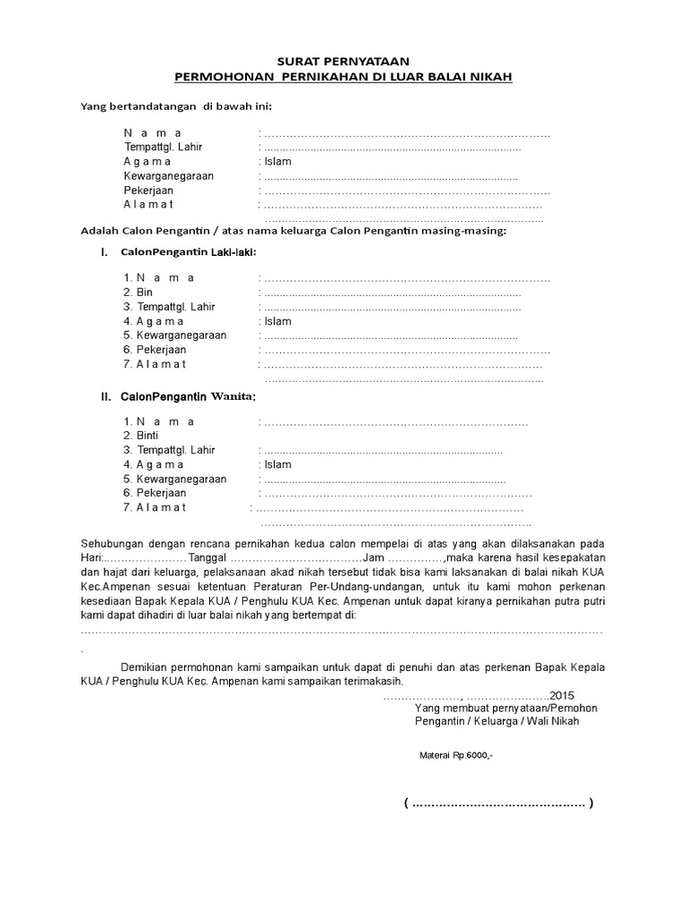 Surat pernyataan nikah dari kua. Akta pernikahan orang tua. Contoh Surat Pengantar Permohonan Surat Kehilangan Buku Nikah dari Kepolisian. Surat rekomendasi pindah nikah dari KUA asal Fotocopy KTP calon pengantin wanitacalon pengantin pria.