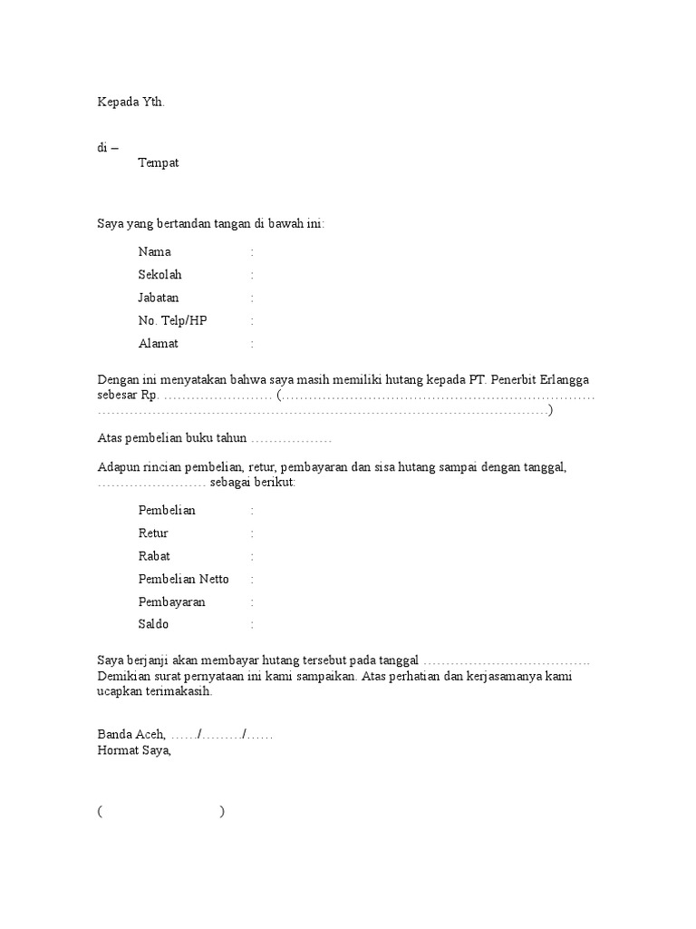 Sebuah surat perjanjian hutang piutang harus memuat berbagai informasi yang lengkap agar tak menimbulkan kerancuan terutama tentang pihak-pihak yang terkait besarnya nominal yang dipinjamkan dan hak dan kewajiban masing-masing pihak. Saya yang bertanda tangan di bawah ini. Contoh surat perjanjian hutang piutang artikel ini berisi 3 contoh bentuk surat perjanjian yg berhubungan dgn hutang piutang atau pinjam meminjam uang.