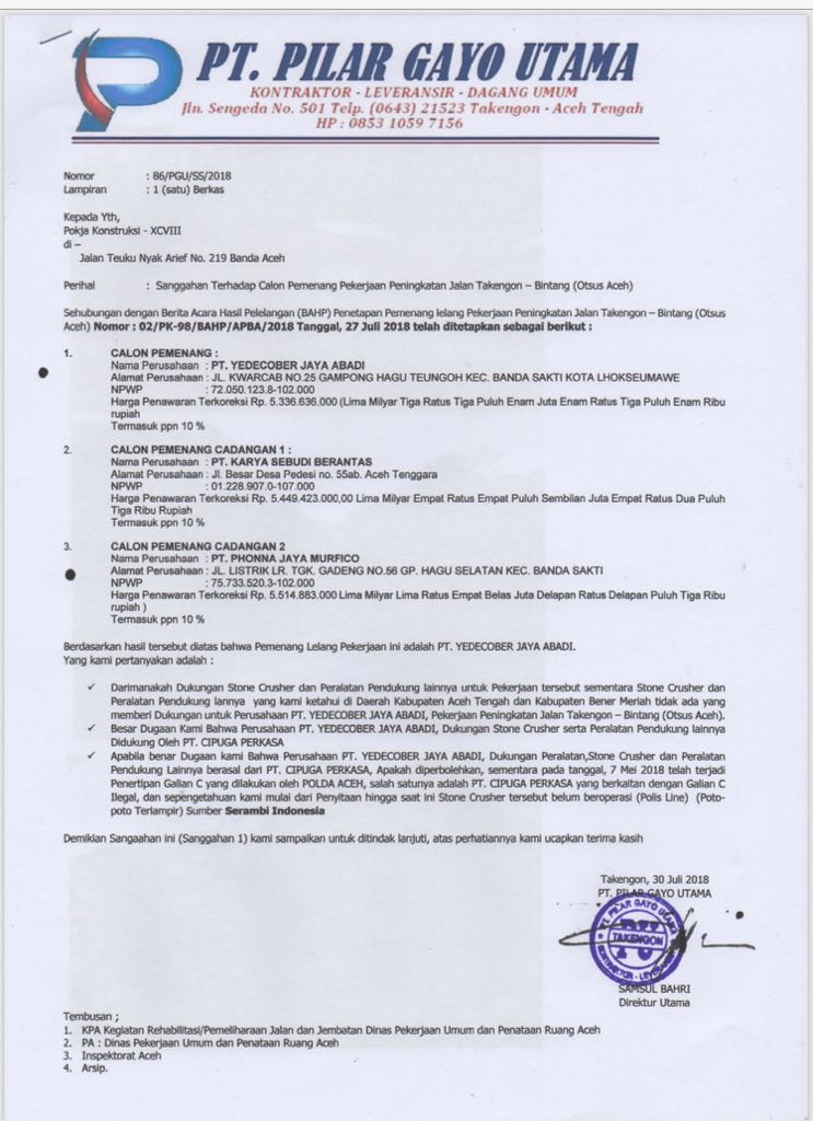Sanggahan Keputusan Pemenang lelang Sehubungan dengan Pemenang lelang dengan Berita Acara Hasil Pelelangan BAHP. Surat dukungan tender menjadi sebuah nilai plus bagi suatu perusahaan yang berniat menawarkan diri menjadi supplier. Penyimpangan terhadap ketentuan dan prosedur yang diatur dalam Perpres dan Dokumen pengadaan Rekayasa yang mengakibatkan persaingan usaha tidak sehat Adanya penyalahgunaan wewenang oleh Pokja ULP.