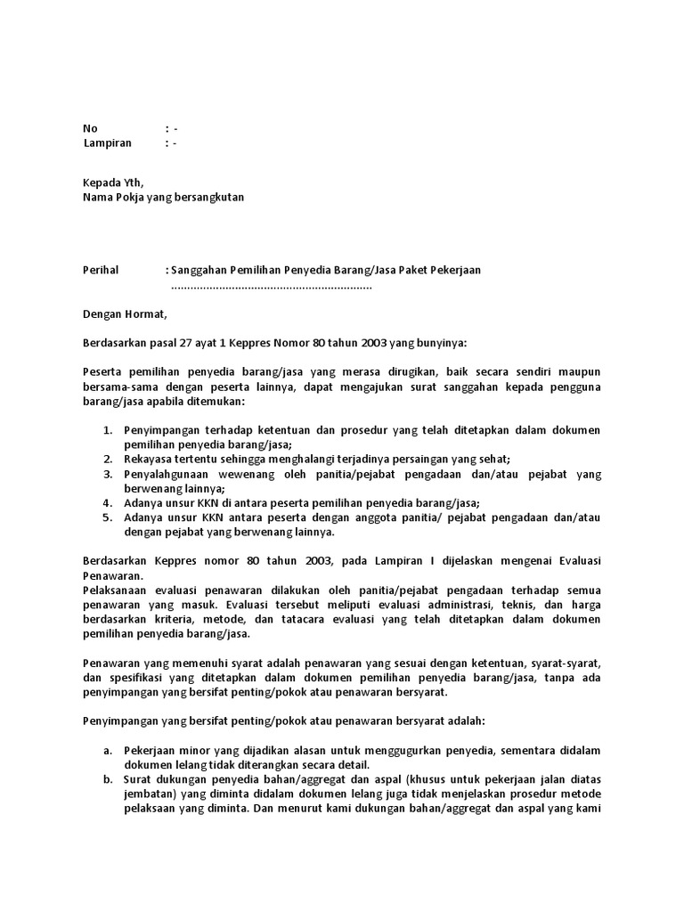 Surat Sanggahan contoh Wiwin Rasni Nomor. Sanggahan tersebut telah dijawab oleh panitia lelang yang bunyinya sbb. Contoh Surat Sanggah Tender Contoh surat sanggahan tender lpse contoh 1 senin 01 agustus 2016 contoh surat sanggahan kepada yth.