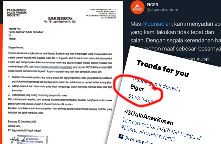 Produsen peralatan aktivitas outdoor dantravelingEiger belakangan ini membuat heboh jagat media sosial Twitter setelah aksinya memberikan surat terbuka kepada seorang YouTuber.