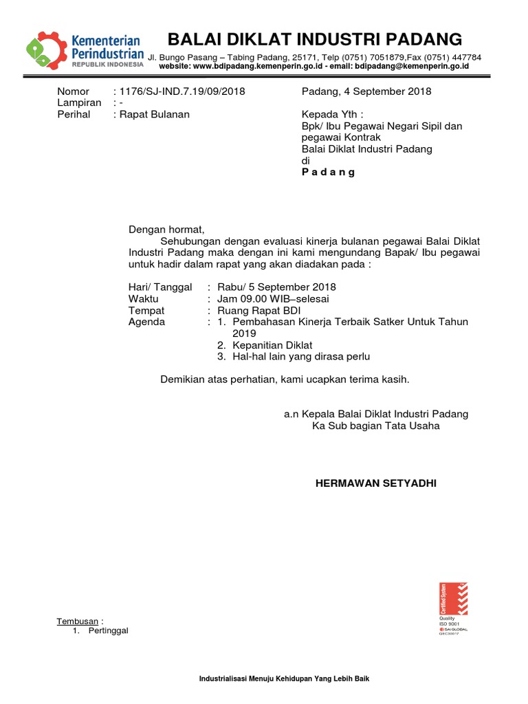 Surat undangan rapat perusahaan kepada karyawan. Tujuan dari rapat tersebut dapat berupa media komunikasi antara pimpinan dengan para bawahannya serta memberikan kesempatan kepada para bawahan untuk menyampaikan pendapat saran serta ide-ide langsung kepada pimpinan. Kumpulan Gambar Contoh Surat Sk Karyawan Terbaru 2019. Untuk mendownload contoh surat undangan rapat dalam format DOC silahkan klik link berikut ini.